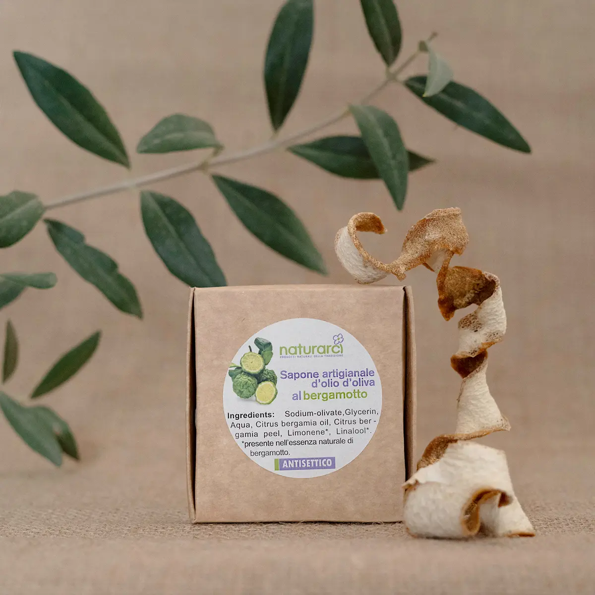 Realizzato con olio d’oliva, essenza di bergamotto bio e bucce del frutto essiccate naturalmente.